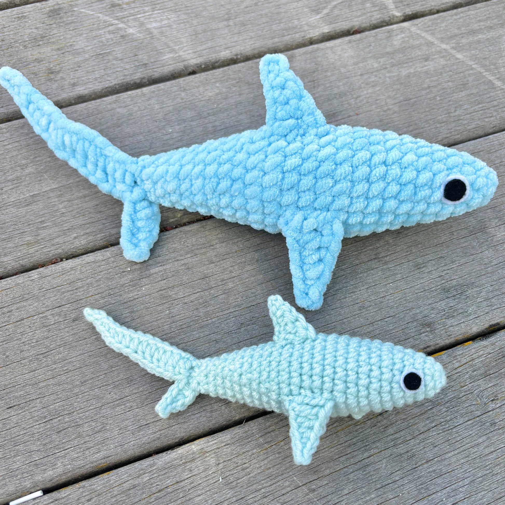 Thresher sharks are known for their distinctive long tails, but what I love most about them are their almost cartoonish eyeballs :) This love for their derpy, anxious looks inspired me to make a pattern in their honor!